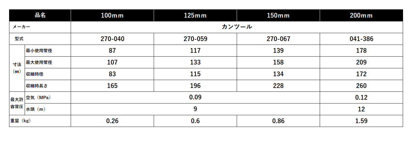 管内の清掃や補修作業などの際に一時的に止水するために使用される器具。エアで膨張、管内に密着させて止水する